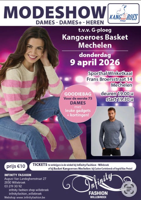 Op donderdag 9 april 2026 organiseren we een fantastische modeshow t.v.v. de G-ploeg van Kangoeroes Basket Mechelen 🏀💜