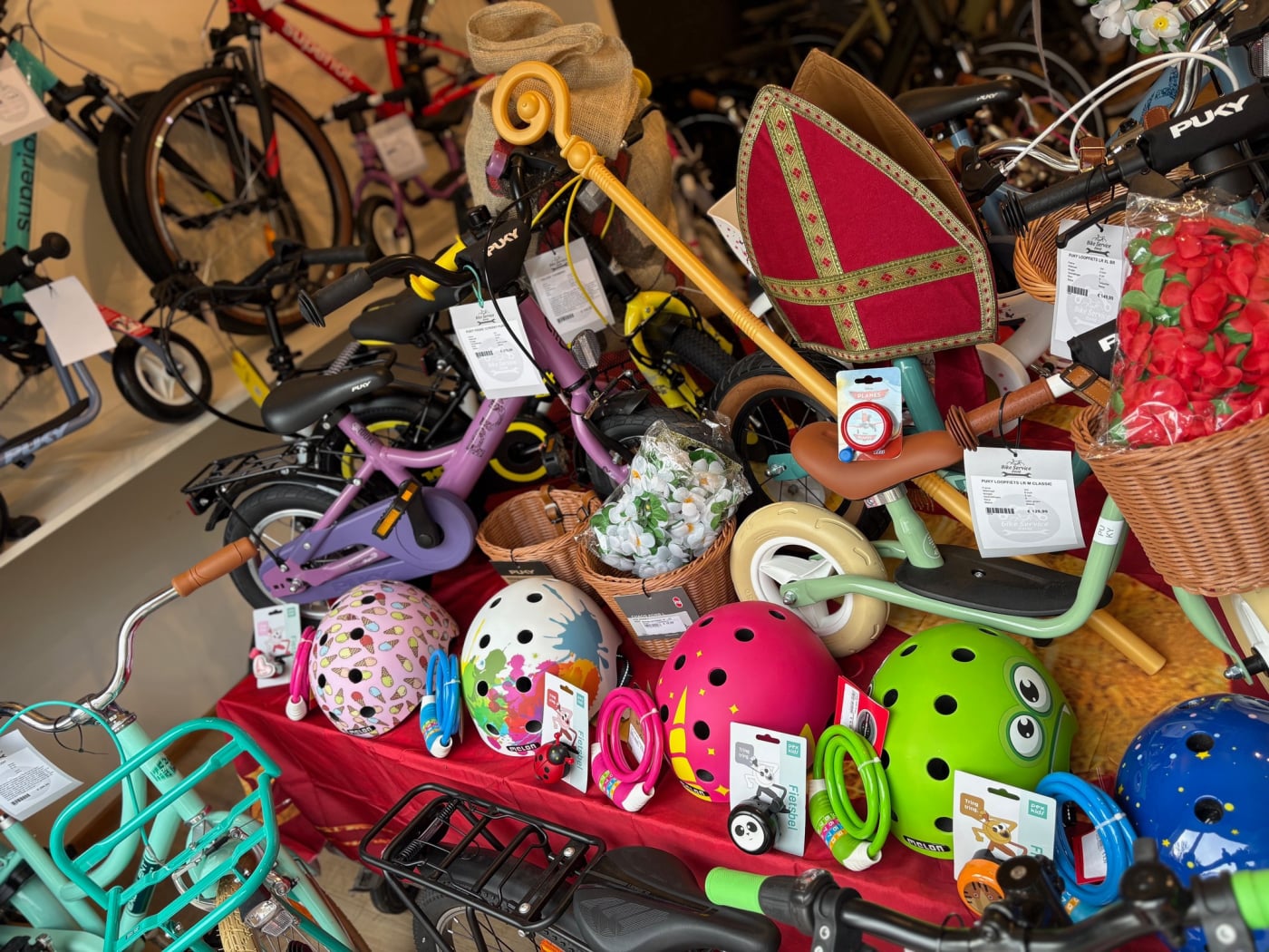 En hij heeft alvast heel wat leuke kadootjes in onze winkel klaar gezet! Van loopfietsjes tot stoere jongensfietsen en hippe meisjesfietsen. Van bellen en sloten tot leuke mandjes en stevige helmen.